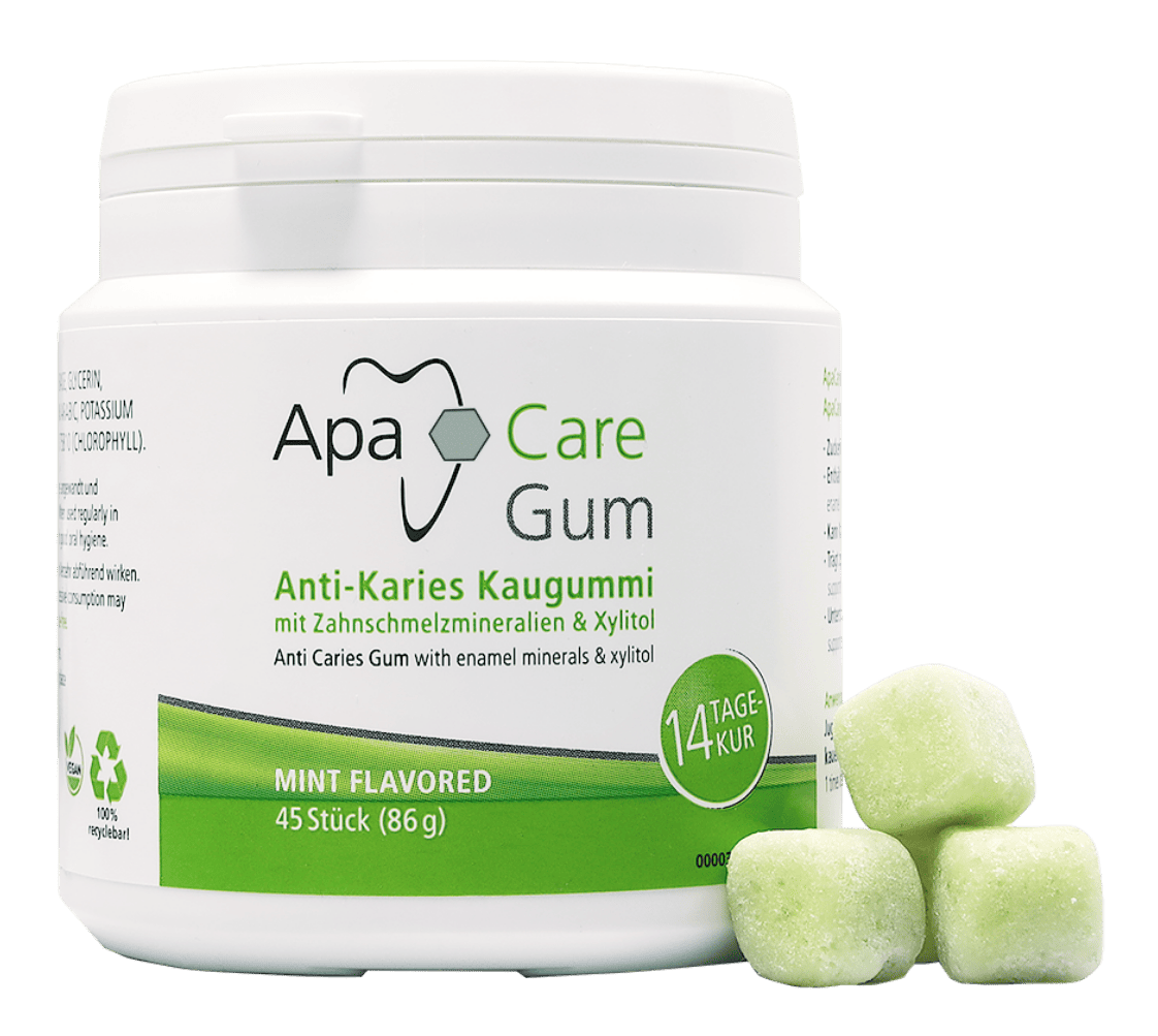 ApaCare tyggjóið inniheldur náttúruleg glerungssteinefni og xylito, eykur munnvatnsflæði og er sykurlaust.